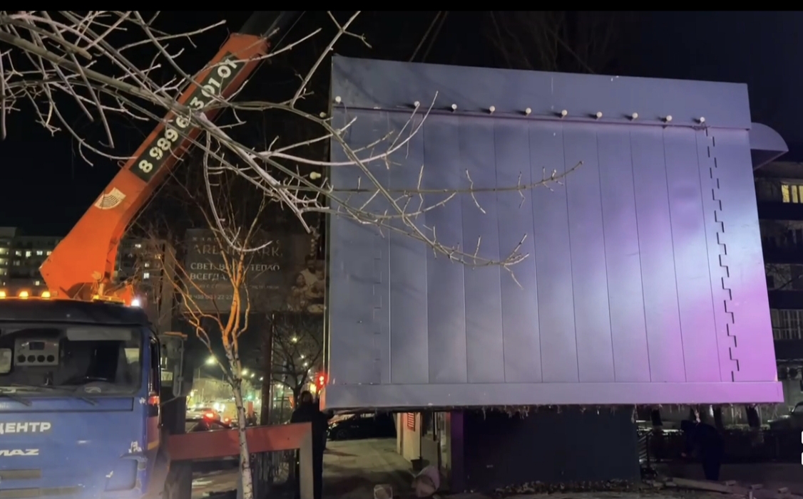 Конструкция была демонтирована и вывезена в установленном порядке. В ближайшее время планируется демонтировать и соседний торговый объект.