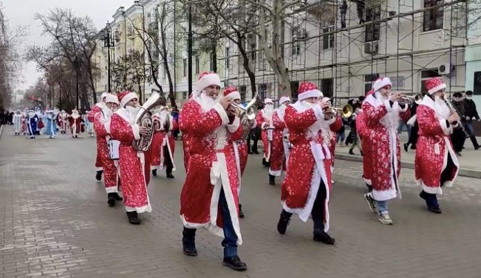 Парад Дедов Морозов состоялся в Махачкале сегодня, 28 декабря. Шествие началось на аллее им. Р.Гамзатова и продлилось до центральной площади города.