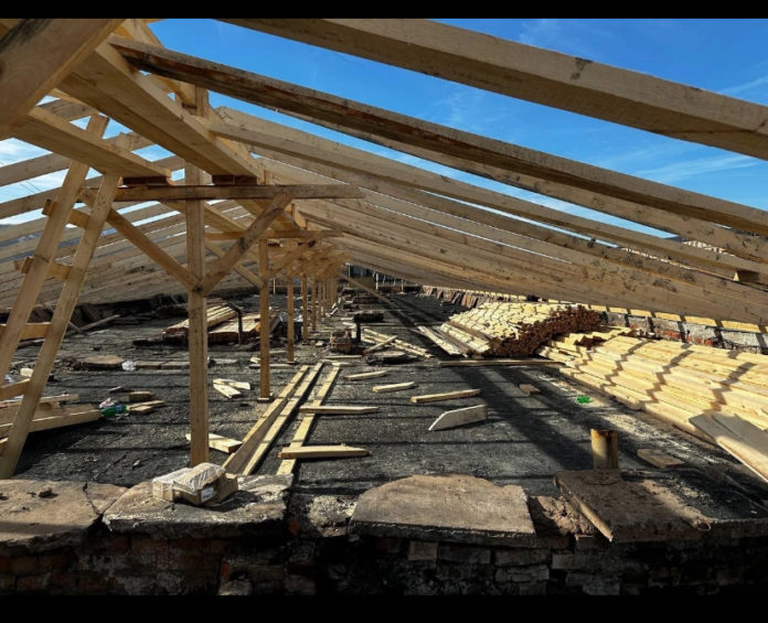 На данном этапе проведены следующие виды работ: очистка крыши от всех поврежденных материалов, таких как изоляция и кровельные материалы, демонтирована старая конструкция, идет монтаж стропильной системы.