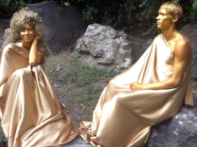 Я, конечно, когда-то видела Валентина во Флоренции, эпатажно раздающего направо и налево поцелуи, причмокивающего и подмигивающего так крепко, будто вовсе не был статуей! Скорее, живее всех живых! Лишь его очень белый окрас давал повод для размышлений. Т.е. это самые обычные, даже очень живые люди, которых красят в золото, серебро, надевают вычурные шляпы, парики (тут уж как с образом повезет) и пускают по парку. Туристы с ними фотографируются, радуются, словно маленькие дети, трогают, проверяют, живой ли. Увидела я это чудо, посмотрела-посмотрела и пошла работать такой же статуей. Где и когда я еще побуду красивой, да еще и статуей. И знаете, что? Пожалуй, я никогда еще себя не чувствовала более живой! Правда, дело немного грязное, пыльное, процесс покраски довольно трудоемкий, тонкий, но безусловно завораживающий! Интересно, как движение за движением художники придумывают «тебя», подбирают цвет, образ, аксессуары, трудятся над тобой… Статуей я работала на набережной в вечернее время в компании остальных таких же городских сумасшедших – статуй, как и я, за 2000 рублей, иногда чуть больше, иногда чуть меньше. И ты такой не ты, весь золотой, красивый, романтичный и не очень, дерзкий и веселый, смешной и трогательный. Я прекрасно понимаю тех прохожих, которые останавливались, смотрели на нас и терялись, раздумывая, потрогать или пройти мимо подобру-поздорову… Глядя потом в зеркало, мне хотелось пройти мимо. Себя. Ах, менять образы оказалось весьма занятным делом! Самым занятным! И это относится не только к работе живой статуей.