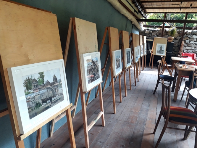 Акварель Мусаевой расположилась на импровизированных мольбертах. Ее присутствие здесь ничем не подчеркнуто. Работы не бросаются в глаза – они как часть общего антуража. Возможно, это всего лишь предлог, чтобы собраться и побыть в тихом уютном пространстве. Ведь пейзажные виды Мусаевой тоже очень спокойные, они рассказывают о тех местах, куда хочется возвращаться вновь, потому что там оставил частичку своей души. Акварель очень женственна: плавные переходы линий, нет глухих тонов, много воздуха и какого-то возвышенного света, даже в пасмурный день. Картины рассказывают о тихой красоте старой архитектуры – шедеврах под открытым небом, о природе, обрамляющей эти памятники истории. И в них сквозит грусть, возможно, от того, что здания, пожившие не одно столетие, не вечны и надо успеть налюбоваться их присутствием.