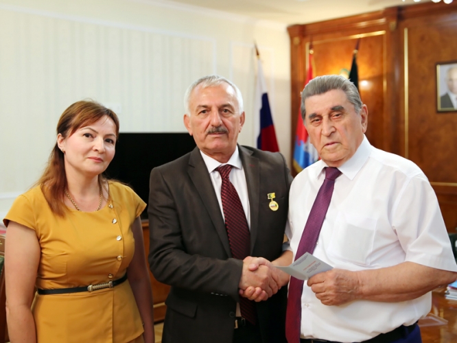 Председатель Дагестанского рескома профсоюза работников государственных учреждений и общественного обслуживания РФ Ахмед Ахмедов вручил юбилейные знаки «100 лет профсоюзам работников государственных учреждений России» врио главы г. Махачкалы Абусупьяну Гасанову.