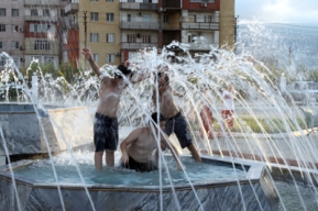 Там же, в Редукторном поселке возле кинотеатра «Пирамида», дарит свою прохладу фонтан, похожий на бутон хризантемы. Струи его невысокие, но в этих блестящих серебристых струях хватает места окунуться местным мальчишкам. Рядом, на скамейках, молодые мамаши с маленькими детьми. Всем хочется свежести и прохлады!