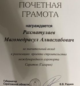 «Рахматулаев Магомедрасул Алиасхабович награждается за значительный вклад в реализацию проекта строительства международного аэропорта “Гагарин” в Саратовской области», – отмечается в документе.