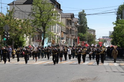 Митинг продолжился праздничным шествием к парку им. Ленинского Комсомола. Участники парада возложили цветы к памятнику Воину-освободителю и к Аллее Героев, также состоялось возложение цветов и венков на воинском кладбище.