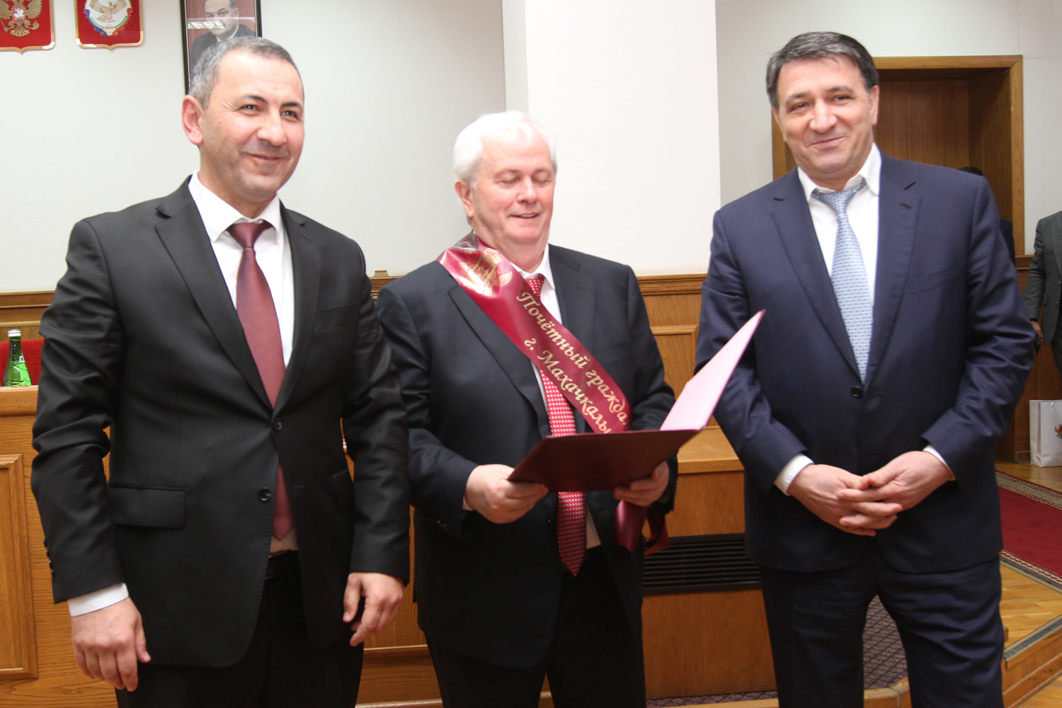 Вначале были торжественно вручены удостоверение и диплом «Почетный гражданин города Махачкалы» председателю Общественной палаты столицы Салиму Абдулкадырову. Затем депутату Горсобрания Аделе Татарко вручили Благодарственное письмо от командира 429-го мотострелкового полка за гражданское мужество и активное участие в оказании помощи военнослужащим.