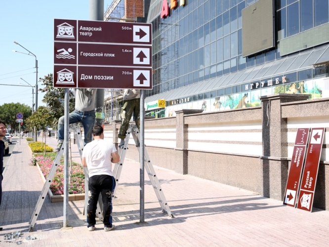 Заместитель главы города Запир Алхасов отметил, что работы проводятся в рамках реализации приоритетного проекта развития Дагестана «Человеческий капитал»: «Главная задача, которая стоит перед нами, – облегчить передвижение туристов в Махачкале. Они должны знать, куда ехать, в какой гостинице поселиться, где находятся объекты общепита, что можно посмотреть. Знаки устанавливаются на магистральных улицах, вблизи крупных торговых центров и объектов культурного значения. Это особенно актуально в канун юбилея города, когда мы ожидаем большой поток гостей из других муниципалитетов Дагестана и субъектов Российской Федерации».