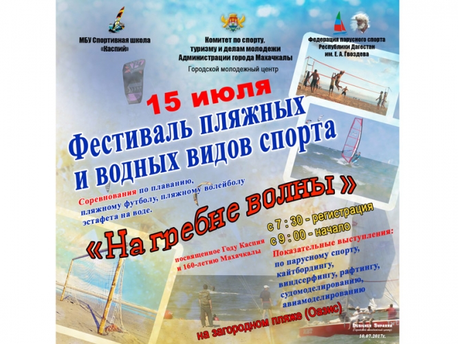 Уважаемые жители и гости столицы! Приглашаем вас 15 июля в 8:00 на загородный пляж «Оазис», где пройдет фестиваль водных и пляжных видов спорта «На гребне волны».