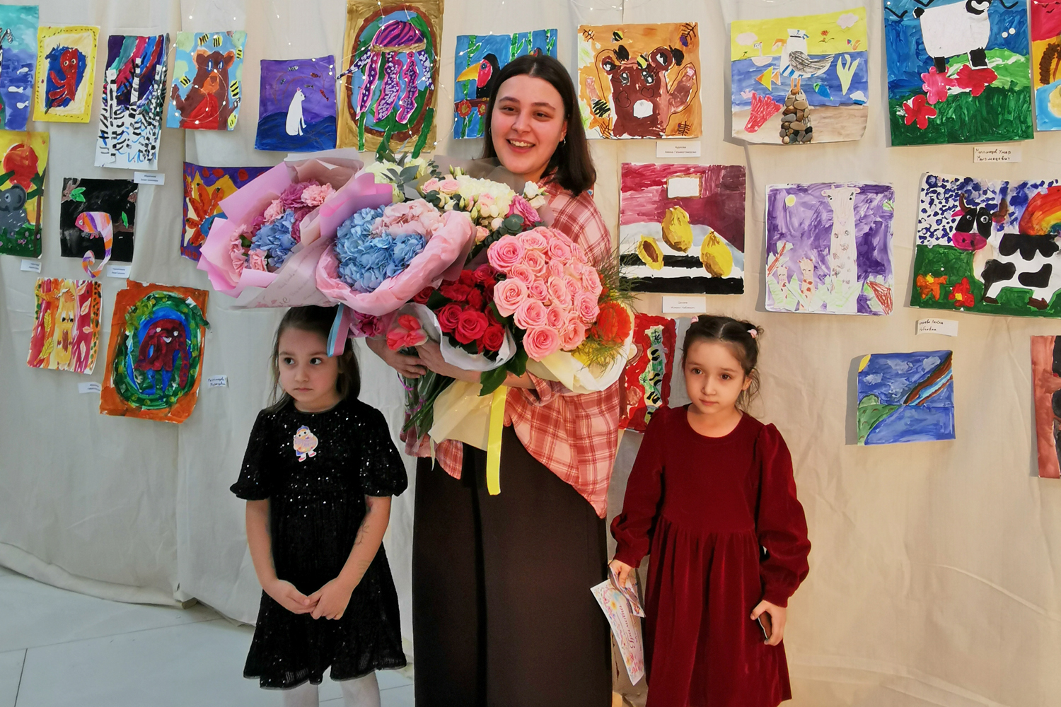 Художник Заира Магомедова, мама двух участниц выставки, признается: хотя она сама может научить детей азам рисунка, у Дины ее девочки раскрываются совершенно иначе. «Искусство с Диной – это легкость и новое восприятие реальности. Она не просто учит, она создает атмосферу, в которой дети раскрепощаются. Она креативит и вкладывает душу в деток. Знает, как каждого похвалить, а когда и аккуратно пожурить. Дети считывают эту ее искреннюю любовь и тянутся к ней. А какие удивительные у нее походы в музеи! Мои девочки несколько раз были в рыбном музее, и, если будет новая экскурсия – пойдут с удовольствием снова. Скелет динозавра в биологическом музее ДГУ – один из любимых персонажей их рисунков. Волшебная атмосфера бывает и во время походов в театральное закулисье. Я сама получаю огромное удовольствие. Мои девочки меня ругают, если мы случайно пропускаем эти мероприятия», – поделилась Заира.