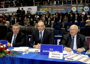 Президента международной федерации объединенных стилей борьбы сопровождали его супруга Мадлен Мартинетти, технический делегат, член бюро Ахрол Рузиев, помощник президента, член ФИЛА Степан Казарян.