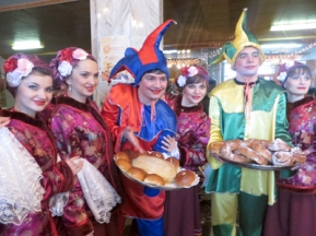 Начался праздник с развлекательной программы в фойе театра, где были накрыты столы с угощением. По традиции прошла и веселая блинная ярмарка с участием ряженых, скоморохов, зазывал, где каждый желающий мог попробовать блины, приготовленные русскими хозяйками. Каждая старалась, чтобы ее блины разобрали как можно быстрее. Мастерицы старались удивить разнообразными рецептами, которые зависят исключительно от их фантазии. И по праву можно сказать, что это у них получилось. Гостей праздника ждала и небольшая ярмарка: здесь и предметы традиционного русского искусства, и столовые приборы из дерева, и оригинальные сувениры и многое другое. Недалеко от них расположились ставшие уже постоянными гостями представители Ставропольского края с разнообразными видами меда: лучшие сорта меда Ставрополья, белый мед специально из Башкирии и другие виды. – В Дагестане нашу продукцию хорошо знают и, главное, любят. А сегодня мы попали на такой замечательный праздник, что нам вдвойне приятно оказаться здесь, – говорит Зоя Ананьева, представитель пчеловодческого хозяйства. Так что пришедшие на праздник смогли не только развлечься, но и сделать покупки.