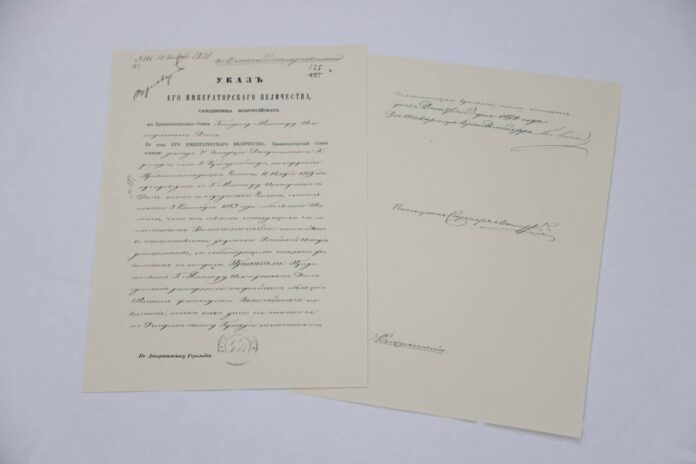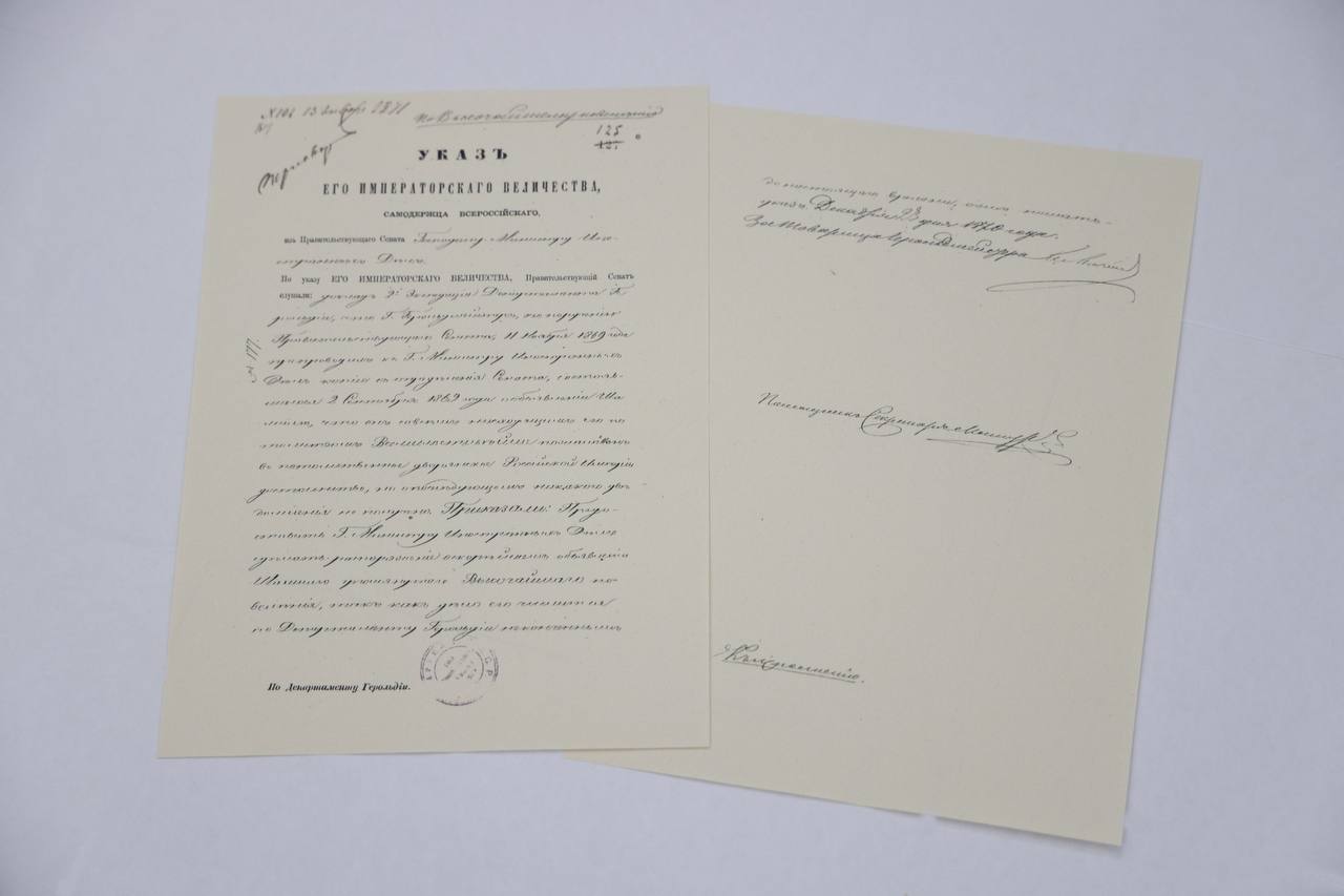 Первый – приказ от 1870 года об объявлении о возведении легендарного имама Шамиля в потомственное дворянство по решению императора Александра II.