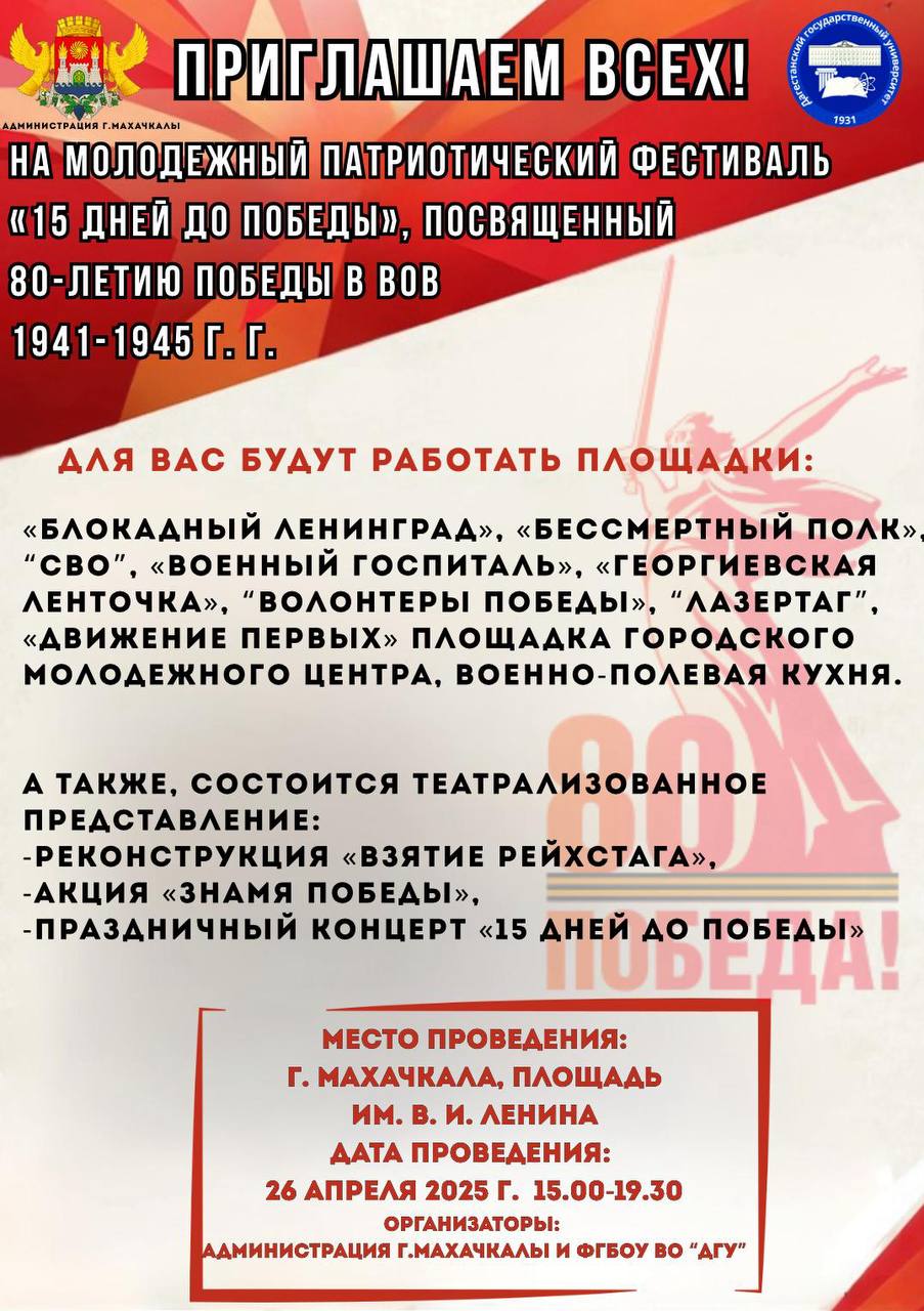 Молодёжный патриотический фестиваль «15 дней до Победы», посвящённый 80-летию Победы в Великой Отечественной войне 1941–1945 годов, пройдёт 26 апреля на центральной площади Махачкалы.