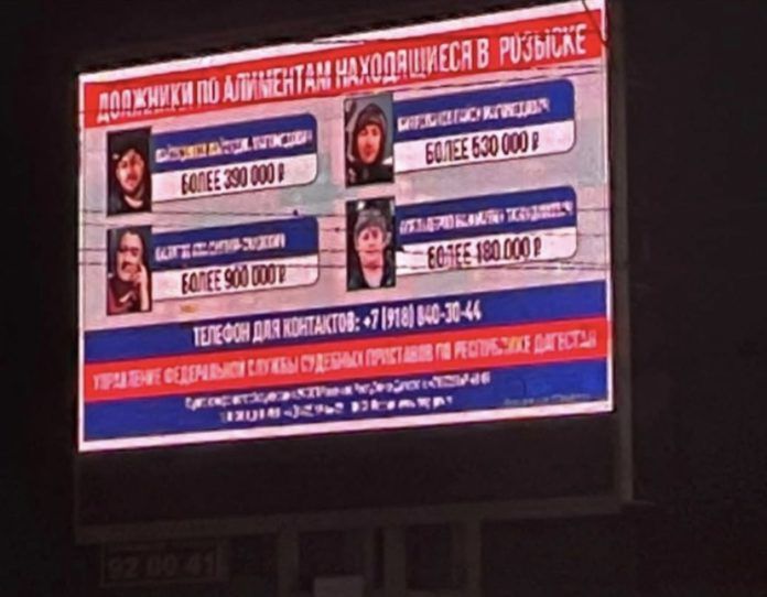 «Данная акция рассчитана на то, что жители города, увидев на светодиодных экранах фотографии должников по алиментам, объявленных в розыск, сообщат имеющуюся у них информацию об их местонахождении в УФССП России по РД», — пояснили в управлении.