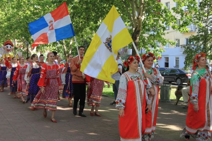 Впереди – барабанщики, чуть поодаль за ними – девушки с флагами России и Дагестана, дальше коллективы со своими руководителями и флагами своих регионов.