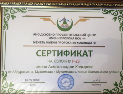 Трое жителей села Андых Шамильского района Дагестана сделали пожертвование на строительство колонны под порядковым номером F-23 будущей мечети с пожеланием, чтобы ей присвоили имя отца нынешнего чеченского лидера Рамзана Кадырова – Ахмата-хаджи Кадырова.