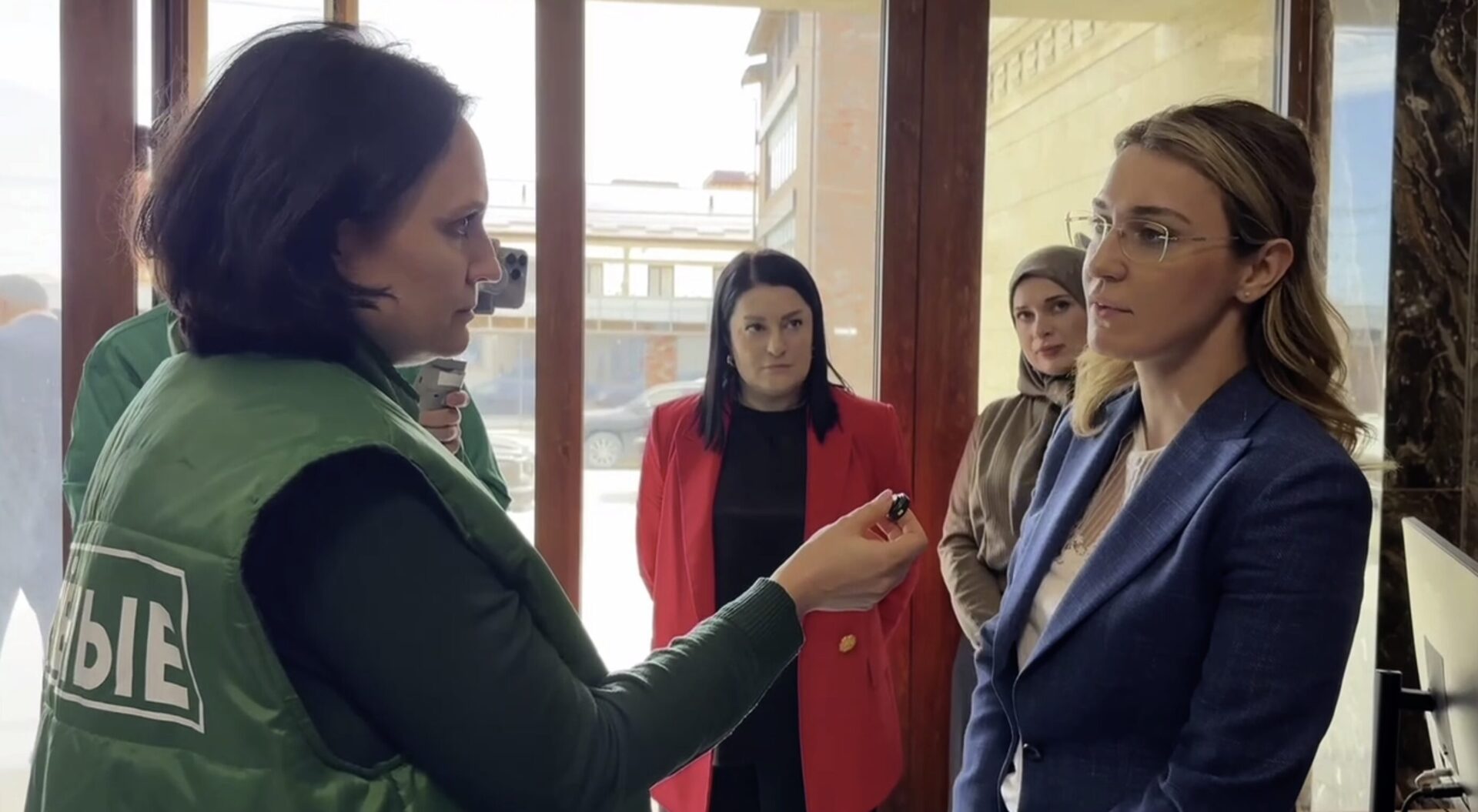 Сопредседателя партии Александру Кудзагову встретила заместитель главы Махачкалы Эмилия Раджабова. Она провела для гостей экскурсию по одному из пунктов временного размещения, организованному в гостинице «Бизо», и подробно рассказала о работе властей по расселению.
