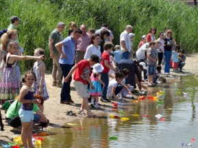 Подкрепившись мороженым в перерыве между действиями, дети принялись выполнять второе задание. На разноцветных листочках бумаги дети написали свои заветные желания. Разноцветные кораблики с желаниями детей были спущены на воду у небольшой песчаной полосы в южной части озера.