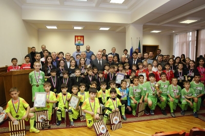 В актовом зале администрации г. Махачкалы состоялось чествование команд-победителей XХ Открытого городского турнира по футболу «Кожаный мяч – 2017», посвященного памяти основателя турнира – заслуженного мастера спорта СССР Льва Яшина, а также 95-летию спортивного общества «Динамо» и 160-летию г. Махачкалы.