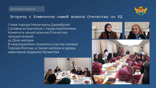 Глава города Махачкалы оказывает поддержку не только напрямую, но и через общественные организации, работающие с семьями участников СВО. К примеру, ко Дню матери Джамбулат Шапиевич встретился с представителями Комитета семей воинов Отечества, среди которых – матери Героев России, вдовы и матери кавалеров орденов Мужества.