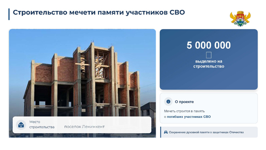 Администрацией города Махачкалы оказывается всемерная поддержка проектов, направленных на увековечение памяти. В частности, на строительство мечети памяти участников СВО в поселке Ленинкент главой города было выделено 5 млн рублей. На слайдах был продемонстрирован каркас здания, свидетельствующий о том, что строительство ведется активными темпами.