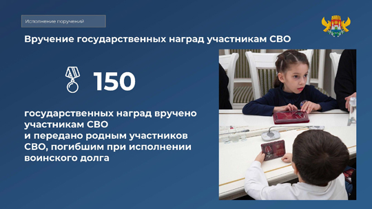 Лично главой города вручено 150 государственных наград участникам СВО и их близким. Встречи с семьями погибших героев проходят дважды в месяц, в рамках которых также принимаются обращения по любым проблемным вопросам.