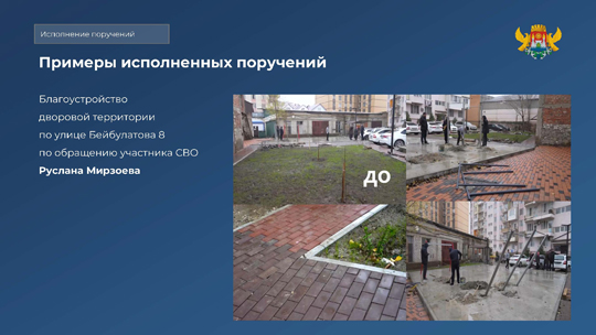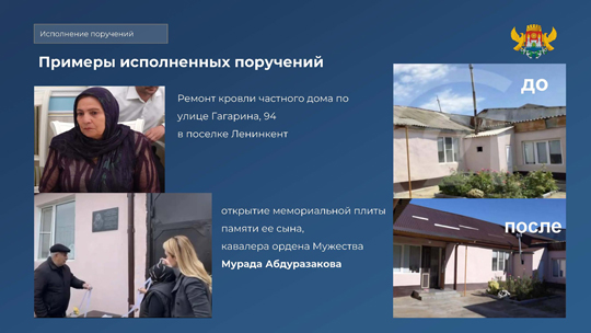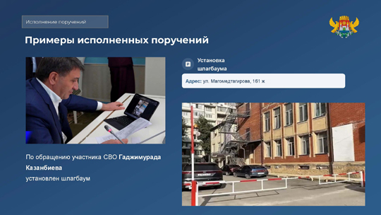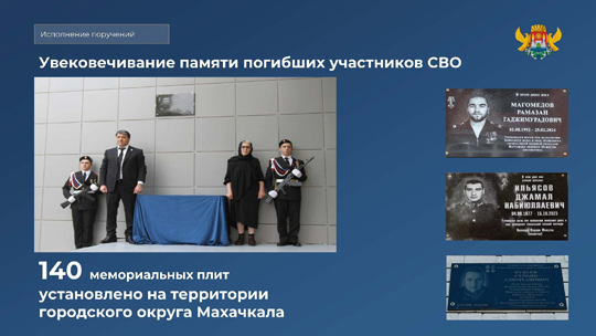 На улице Магомедтагирова, 161 «ж» по запросу участника СВО Гаджимурада Казанбиева, установлен шлагбаум. В поселке Ленинкент, на ул. Гагарина, 94, полностью отремонтирована ветхая кровля дома, где жил погибший участник СВО. В память о кавалере ордена Мужества Мураде Абдуразакове на фасаде данного дома установлена мемориальная плита. Дворовая территория на ул. Бейбулатова, 8 благоустроена по обращению участника СВО Руслана Мирзоева. Здесь появилась новая детская площадка, а рабочие привели участок в порядок.