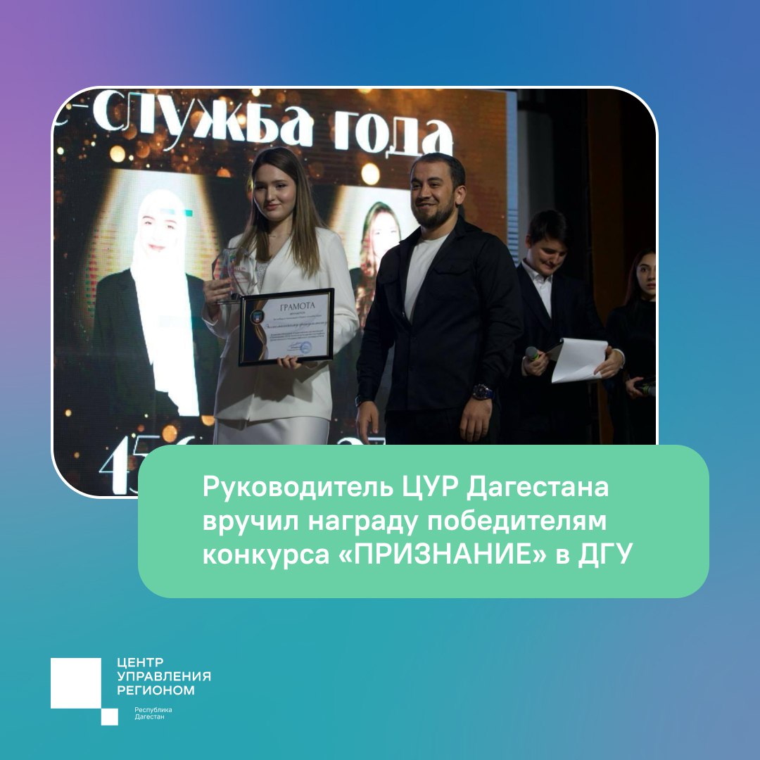 В Дагестанском государственном университете (ДГУ) состоялась торжественная церемония награждения победителей конкурса студенческих организаций «ПРИЗНАНИЕ». Руководитель Центра управления регионом (ЦУР) Дагестана Исрафил Исрафилов вручил награду победителям в номинации «Пресс-служба года».