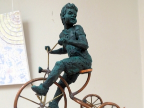 Вот «мысли вслух», например, изобразили. Над ними надо посидеть, проследить линии и угадать, прочитать между строк, какими мыслями была полна голова творца. Или вот «философ», попробуй-ка вычлени его черты из нагромождения линий плавных и округлых. Надо соединять и разделять, чтобы отыскать. Тут без дешифратора не обойтись. И собственно, к чему этот посыл был сделан? В жизни-то философов не сыскать. Одни материалисты – хотят осязать руками, а пощупать глазами для них что-то из рода фэнтэзи. Дальше идем. Тут разные интерьерные штучки от дизайнерских школ – это сегодня очень актуально. Особенно интересно, что могут преподнести наши свет-дизайнеры, насмотревшись по телевизору того, чем потчуют публику заэкранные профи. Вкратце скажу – на выставке это был подоконник, на нем расставлены цветы в горшках, как и полагается, и там же лейка-чайник. Шаг от простого к сложному – незамысловатый и практичный ход. Еще лучше не заморачиваться на всяких идейностях, а остановиться на детстве. Бесшабашном, трехколесном детстве. Которое умчит от изрядно поднадоевших вечно умничающих взрослых. Вот такой шедевр поставить бы дома и любоваться, когда наскучит все проблемное. Или же созерцать круги, которые сделаны бежевым на бежевом фоне. И воображать себе, что это точка, у которой нет отсчета и нет конца. Вечно крутящийся водоворот, в котором и утонуть не посмеешь, и всплыть никто не поможет. Надо надеяться только на себя. Иначе точка превратится в черную кошку. Черную кошку на черном и на голубом фоне. Для суеверных это будет началом черной полосы. Для художника – игра воображения, замешанная на интуиции. Или просто состояние души – желание уйти и спрятаться за черной вуалью от дневного света и людей.