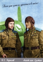 И на самом деле, многие летчики знали, что когда немцы видели в воздухе самолет с эмблемой горного орла, они тут же уходили от воздушного боя. А еще летчики поинтересовались огромным количеством звезд на самолете Амет-Хана Султана. И на этот вопрос отвечал Иван Борисов: «Вот таков наш командир, вот таков наш боевой товарищ. У него число сбитых самолетов было не меньше, чем у других летчиков, но представление на третью золотую звезду героя ему не подписал Н.С. Хрущев. И знаете, что он при этом сказал? «У нас в стране Ханов нет.» Не любил Хрущев нас, летчиков, страшно не любил».