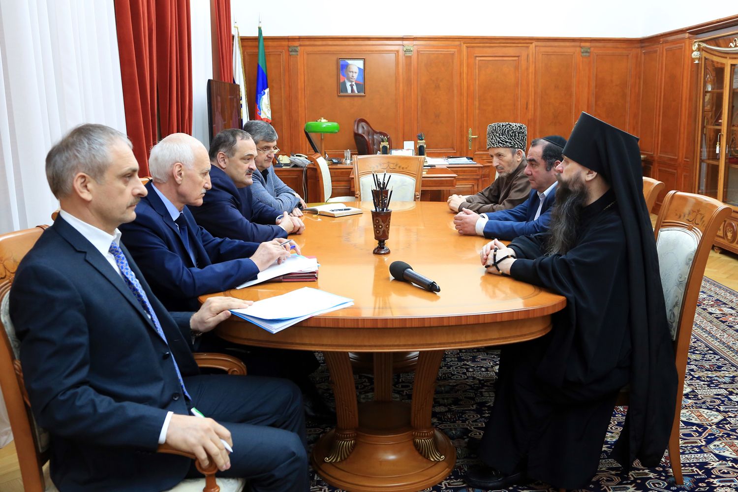 В мероприятии приняли участие муфтий Дагестана, председатель Совета алимов РД шейх Ахмад Афанди, архиепископ Махачкалинский и Грозненский Варлаам, председатель Централизованной религиозной организации иудейских общин РД Валерий Дибияев.