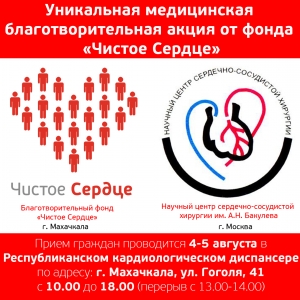 4 и 5 августа в Республиканском кардиологическом диспансере по адресу: г. Махачкала, ул. Гоголя, 41 пройдет уникальная благотворительная медицинская акция, организованная фондом «Чистое Сердце».