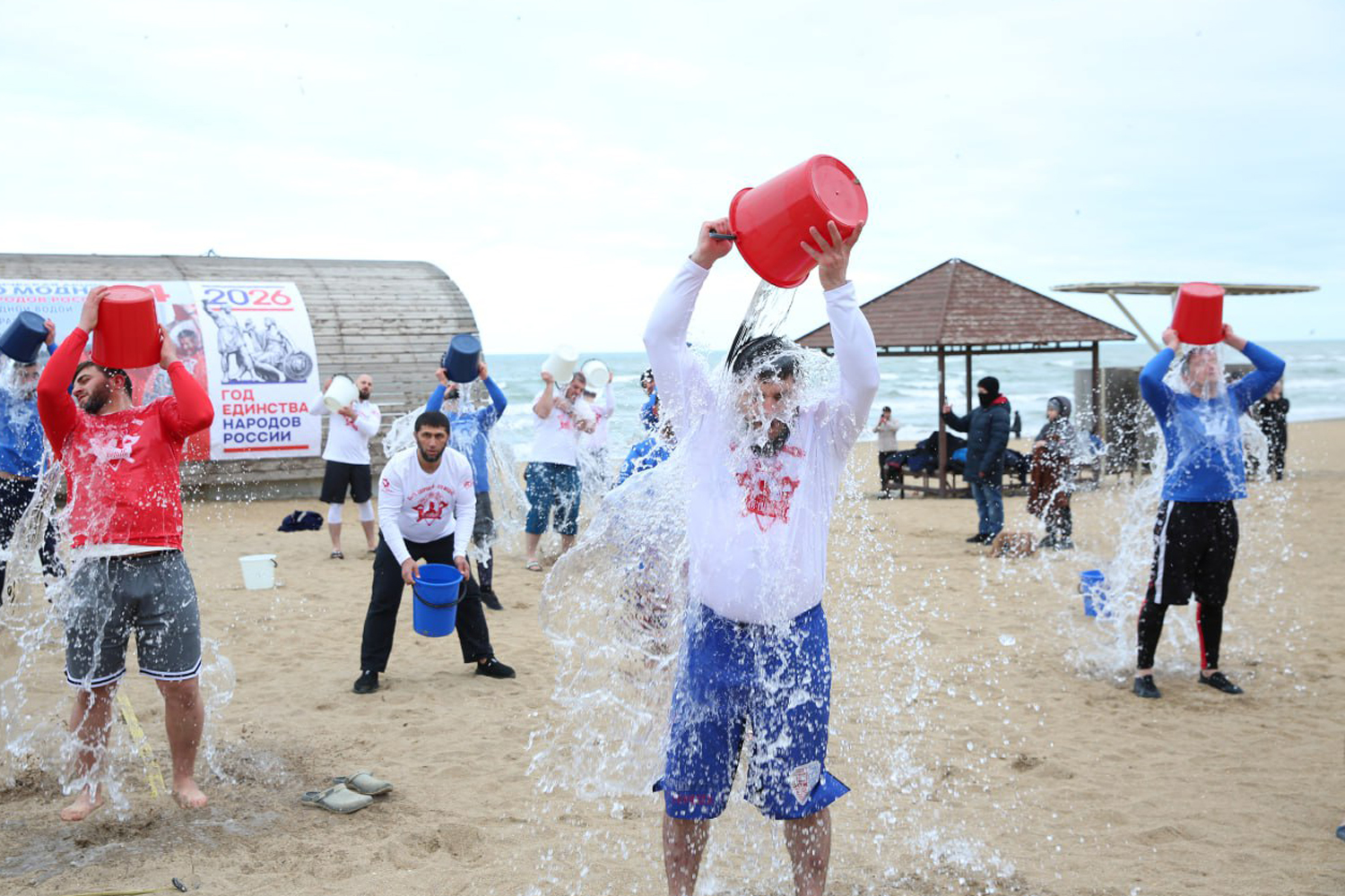 Продолжением события стала масштабная акция, к которой по телемосту присоединились 15 городов России. Кульминацией стало одновременное массовое обливание холодной водой из ведер, оформленных в цветах государственного флага.