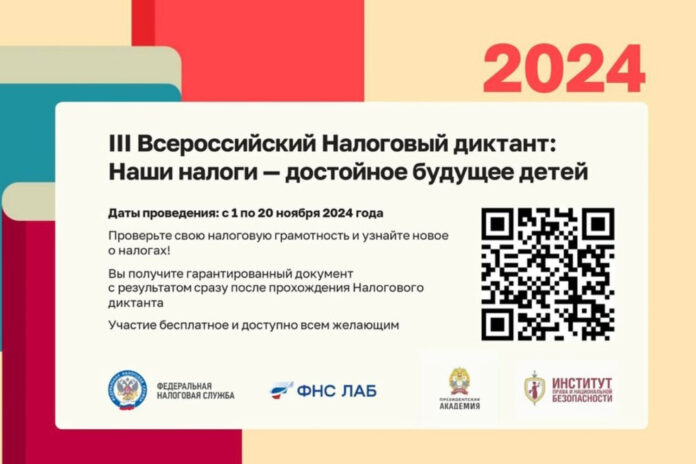 Федеральная налоговая служба и Российская академия народного хозяйства и государственной службы при Президенте Российской Федерации с 1 по 20 ноября 2024 года проводят III Всероссийский налоговый диктант «Наши налоги – достойное будущее детей».