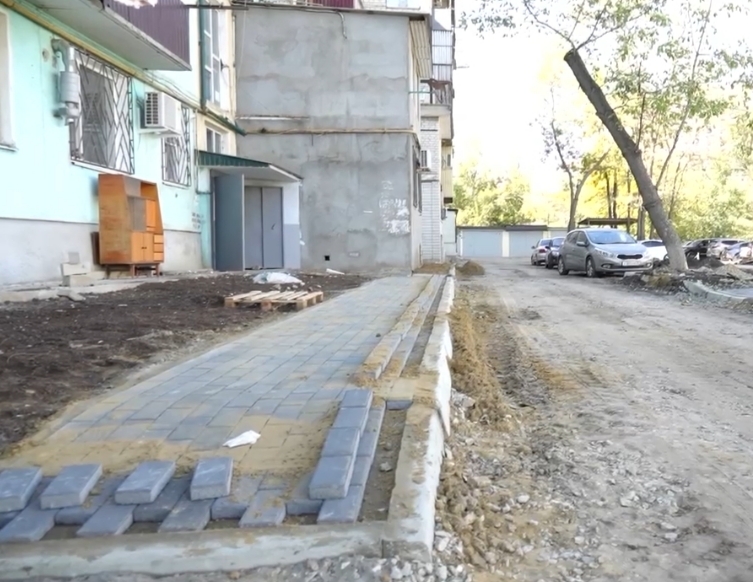 Здесь завершены работы по укладке бордюрного камня, тротуарной плитки, частичному завозу и планировке чернозема, подготовлена детская и спортивная площадки с бетонным основанием под обустройство бесшовного ударопоглощающего резинового покрытия и установку игровых элементов. Затем запланированы укладка асфальтобетонного покрытия, установка двухрожковых столбов освещения, скамеек, урн, беседки и игровых элементов.