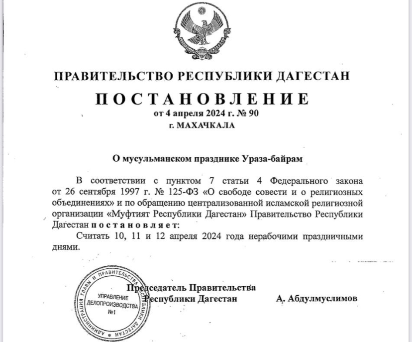 «В соответствии с пунктом 7 статьи 4 Федерального закона от 26 сентября 1997 г. № 125-ФЗ «О свободе совести и о религиозных объединениях» и по обращению Централизованной исламской религиозной организации «Муфтият Республики Дагестан» Правительство Республики Дагестан постановляет: считать 10, 11 и 12 апреля 2024 года нерабочими праздничными днями», — говорится в постановлении.