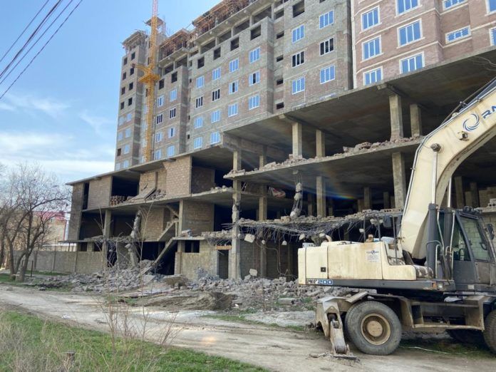 Незавершенное строение демонтируют по решению Кировского районного суда Махачкалы, который признал его самовольным и подлежащим сносу. Поскольку ответчик добровольно не демонтировал объект, осуществляется принудительный снос.