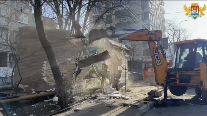 Накануне ночью с объекта были вывезены продовольственные товары; в настоящее время проводится разбор металлоконструкций и освобождение земельного участка от самовольно размещённого сооружения.