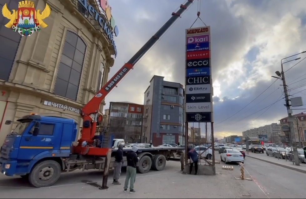 Администрация города продолжает работу по освобождению муниципальных территорий от самовольно установленных объектов. В ходе совместного рейда Управления административно-технической инспекции и Управления торговли был выявлен и демонтирован незаконный объект (стела), располагавшийся по адресу: пр. Акушинского, 3.