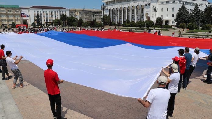 Также на центральной площади Махачкалы сегодня был развернут масштабный флаг Российской Федерации размером 20 на 30 метров в рамках всероссийского флешмоба.