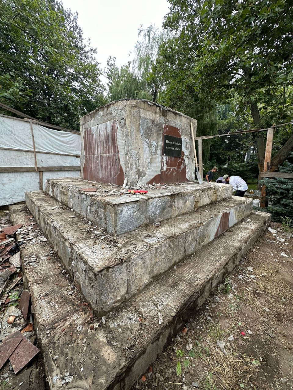 Уже демонтирована облицовка постамента, в ближайшее время она будет заменена, а прилегающая территория благоустроена.