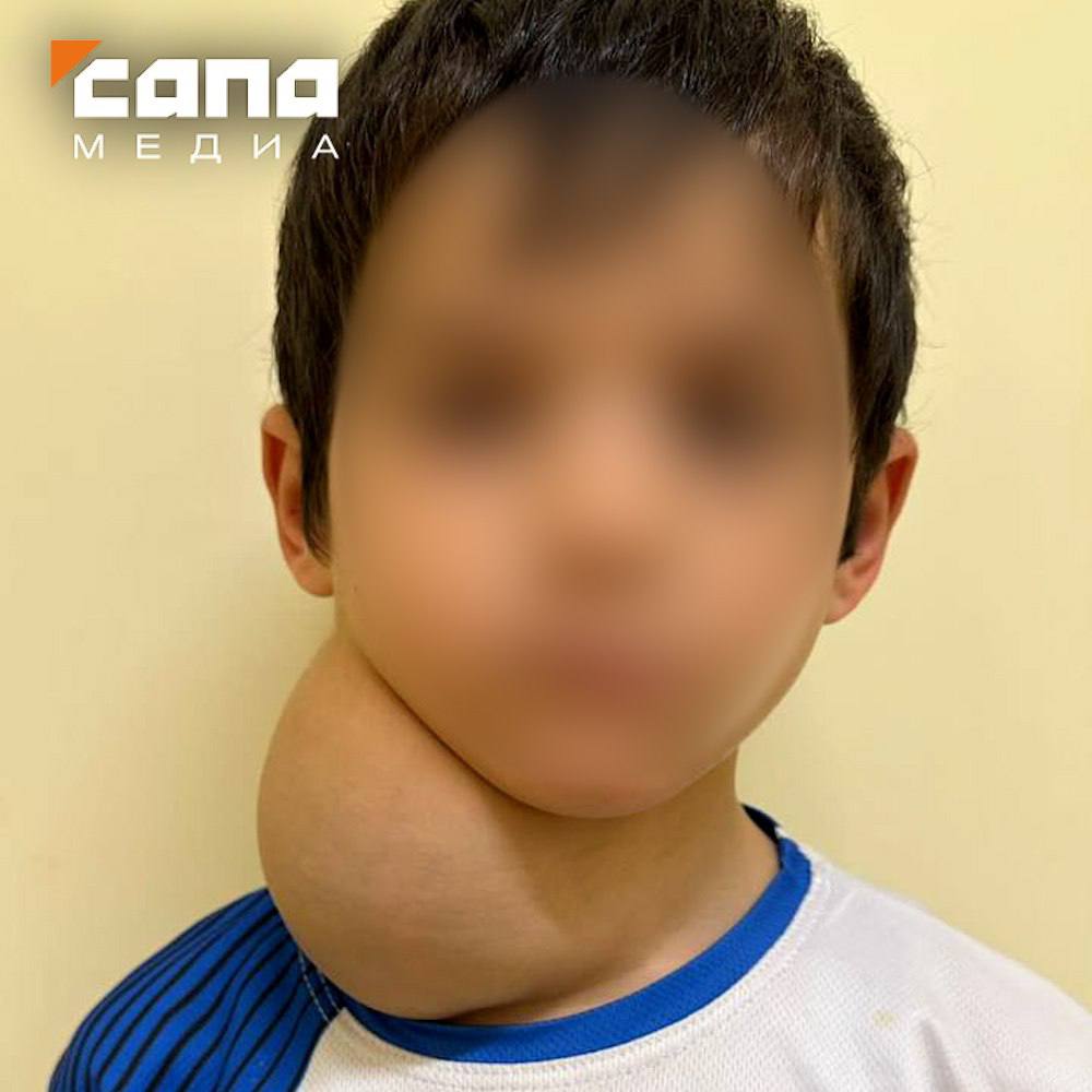 У маленького Курбана припухлость на шее появилась около года назад. Изначально родные предполагали, что это увеличенные лимфоузлы, однако позже выяснилось, что это лимфангиома – редкая доброкачественная опухоль, встречающаяся примерно у одного из 10 тысяч детей. В короткие сроки опухоль разрослась до внушительных размеров.