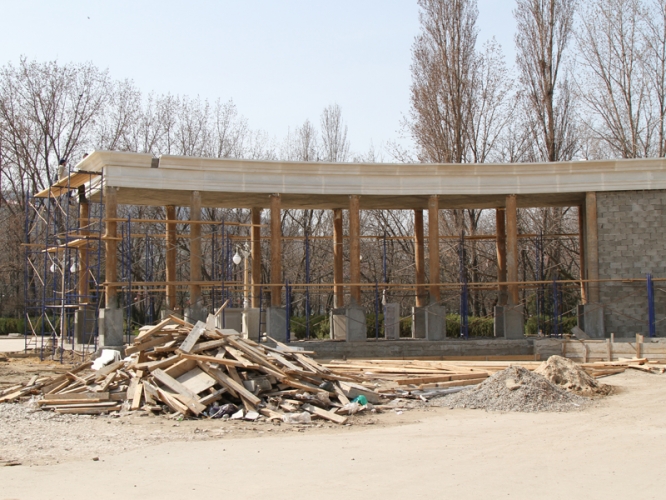 Сегодня на объекте начаты мероприятия по облицовке колонн и карнизов архикамнем. Ширина колоннады – 4 метра, высота – 7,5 м, длина в радиусе – 65 метров, а общая протяженность – 100 метров.