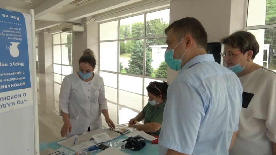 Пункты функционируют в штатном режиме. Перед тем, как провести вакцинацию, медицинский работник осматривает желающего привиться.