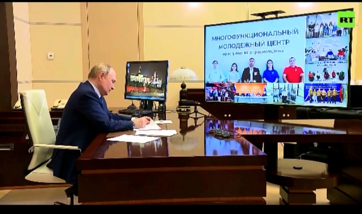 В режиме видеоконференции глава государства поздравил всех с праздником и поговорил с участником СВО, главным специалистом молодежного центра Юсуфом Алимагомедовым.