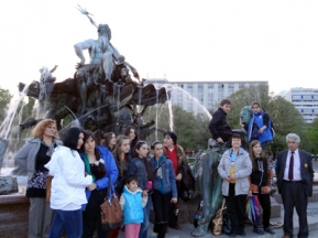 На этой бывшей торговой площади еще один повод для ассоциаций: самое высокое сооружение Германии – 368-метровая Берлинская телебашня уступает Останкинской, и даже Киевской и Рижской. Фонтану «Дружба народов» тоже далеко до одноименного водного комплекса на ВДНХа. Юные дагестанцы, разглядывая фигуры Нептуна и четырех нимф, слушали разъяснения экскурсовода Марии Арманд: четыре фигуры по сторонам олицетворяют четыре реки Рейн, Одер, Лабу, Вислу. В лучах заходящего солнца искрились воды этих рек в одном фонтане. А «Часы мира» с трехметрового столба показывали 21.30 в Москве, а это значит, что в родной Махачкале уже глубокий вечер. Стальной циферблат уникальных часов, называемых «Всемирным временем», а еще чаще именем богини астрономии Урания, показывает одновременно время во всех часовых поясах Земли. Надпись на этих часах «Время разрушит все стены» у германцев и туристов с ноября 1989 года ассоциируется с разрушением Берлинской стены, о судьбе сохранившегося фрагмента которой у Бранденбургских ворот до сих пор идут споры. Начавшийся в марте этого года демонтаж полуторакилометрового участка Берлинской стены вызвал акции протеста, так как на этом участке стены находится Галерея, где граффити, живопись и фотографии художников со всего мира напоминают о границе, многие десятилетия разделявшей германскую столицу.