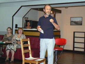 В этот вечер для небольшого круга любителей поэзии стихи читал Муса Асельдерович Гаджиев, старший преподаватель кафедры русской литературы филологического факультета ДГУ, работающий по совместительству учителем русского языка и литературы в махачкалинской СШ №37. Муса Гаджиев — победитель республиканского конкурса «Учитель года — 2003», «Отличник народного образования ДАССР» (1993), заслуженный учитель Республики Дагестан (2000), почетный работник общего образования РФ (2005).